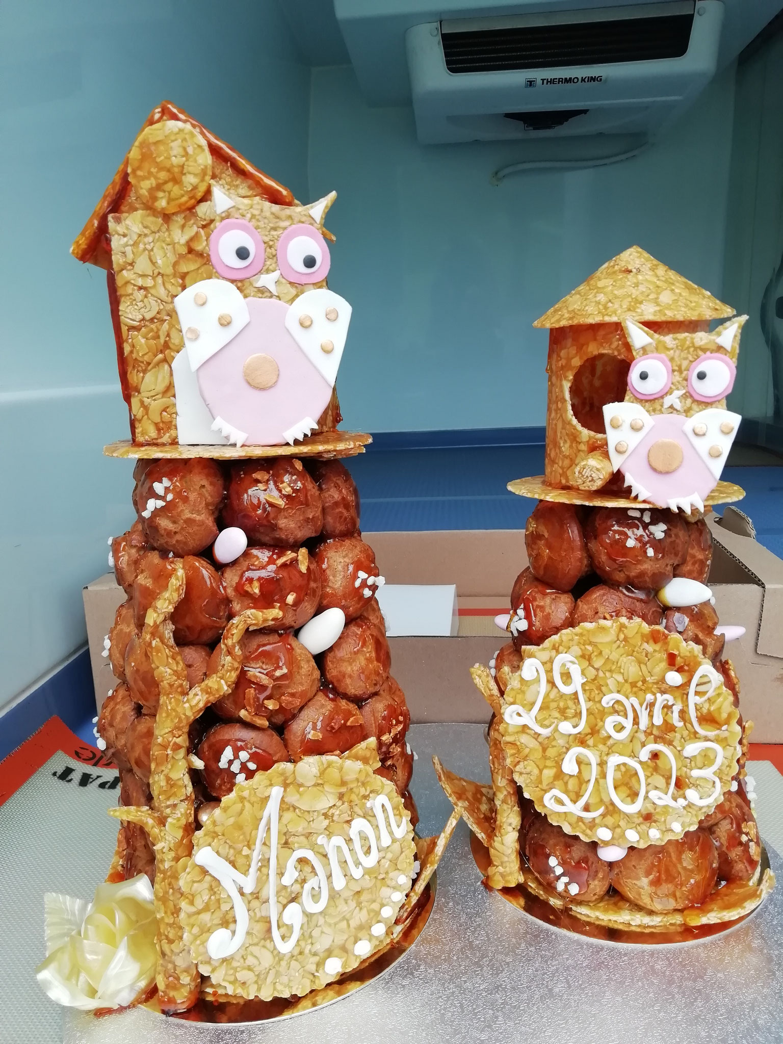 Pièce montée à 1,85 euros le chou (en forme de cône ou cylindre) ou à 2 euros le chou (forme originale), nougatine et dragées compris.